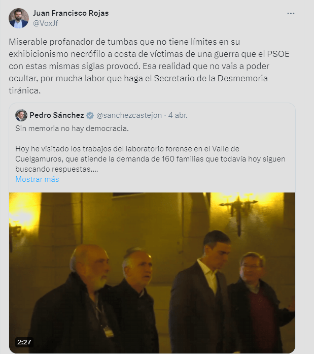 El Portavoz de VOX en el Ayuntamiento de Almería, Juan Francisco Rojas, ha lanzado duras críticas en su cuenta de X contra el presidente del Gobierno, Pedro Sánchez, (PSOE), acusándolo de «miserable profanador de tumbas» y de llevar a cabo un «exhibicionismo necrófilo» a costa de las víctimas de una guerra que, según el Portavoz de VOX, el PSOE provocó con estas mismas siglas.
