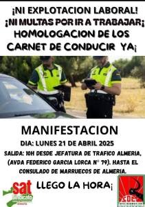 El Sindicato Andaluz de Trabajadores (SAT) convoca una manifestación en Almería para exigir la homologación de permisos de conducir marroquíes El próximo lunes, 21 de abril de 2025, a las… Lee más: El SAT llama a participar en la manifestación por la homologación de los permisos de conducir - La Coordinadora Ecologista Almeriense denuncia a la empresa Lunimar, al Ayuntamiento de Almería y a la Consejería de Medio Ambiente por el incendio de la planta de reciclaje